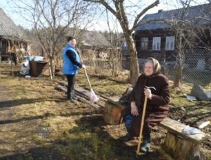 Социальный работник Вера Васильевна Федорова оказала помощь в уборке придомовой территории получателю социальных услуг Марии Федоровне Смирновой, проживающей в частном доме в п.Красный Куст.