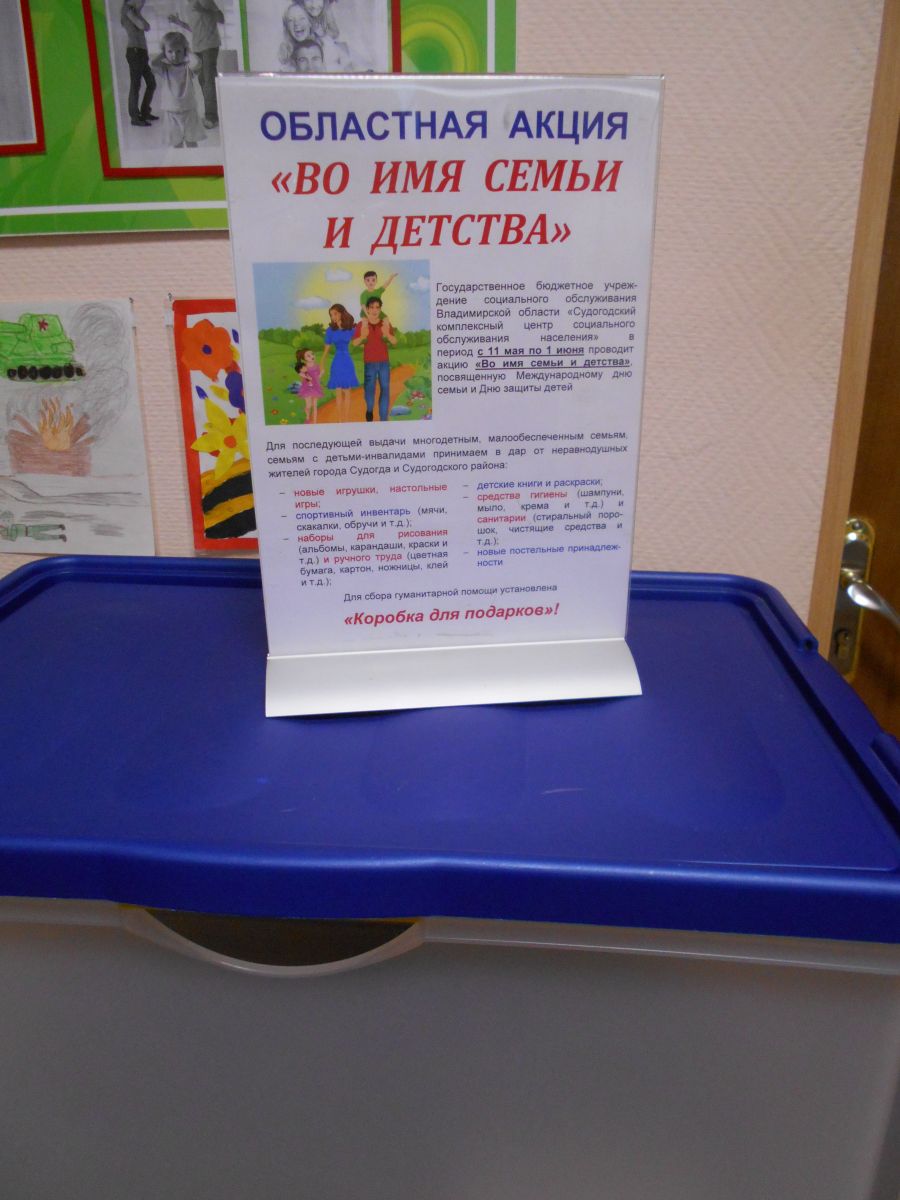 Государственное бюджетное учреждение социального обслуживания Владимирской области «Судогодский комплексный центр социального обслуживания населения» в период с 11 мая по 1 июня проводит акцию «Во имя семьи и детства», посвященную Международному дню семьи и Дню защиты детей.