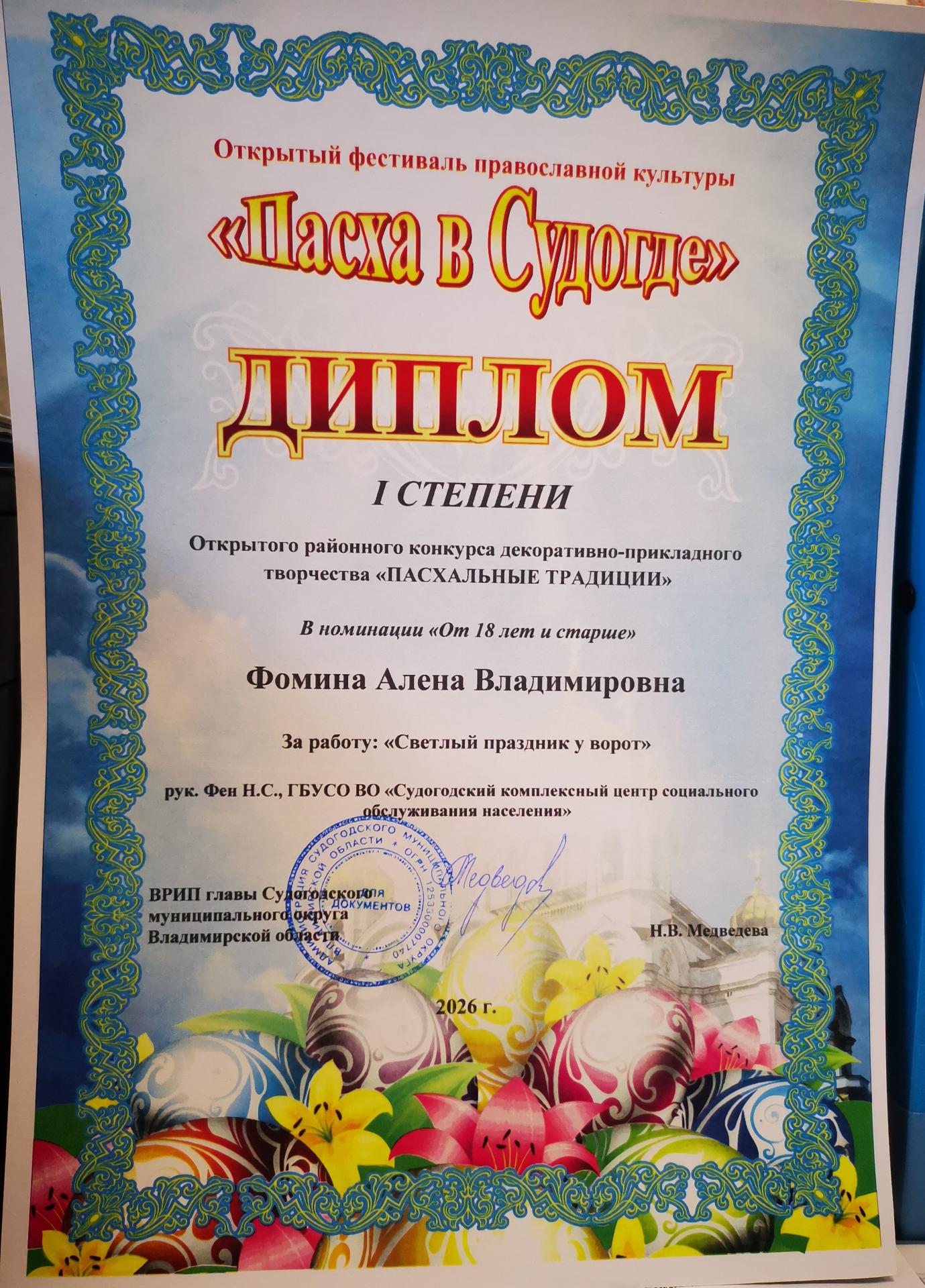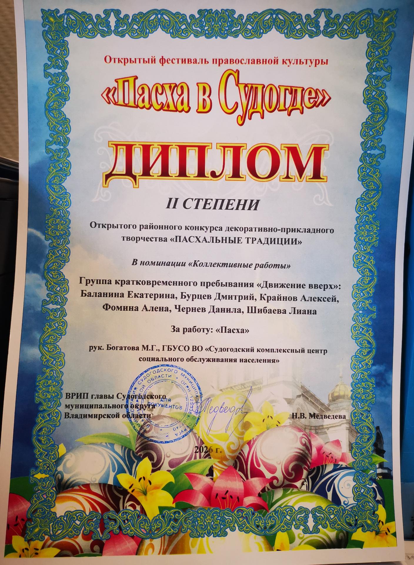 Поздравляем участников группы кратковременного пребывания «Движение вверх» с победой в открытом районном конкурсе декоративно-прикладного творчества «ПАСХАЛЬНЫЕ ТРАДИЦИИ», который проходит в рамках Открытого фестиваля православной культуры «Пасха в Судогде».